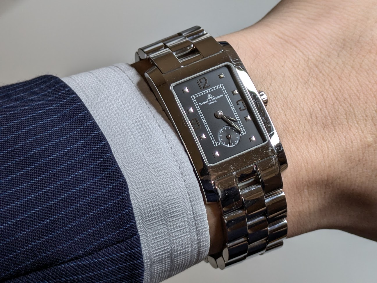 • 厚み: 薄型設計でスーツの袖口に収まる